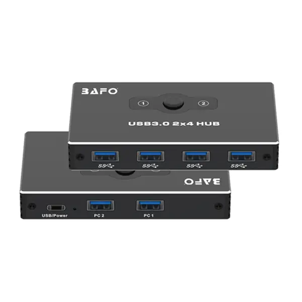 این محصول یک سوئیچ KVM ساده نیست؛ بلکه یک مرکز اشتراکگذاری کامل است. با داشتن ۴ عدد پورت خروجی USB، شما میتوانید نه تنها کیبورد و ماوس، بلکه دو دستگاه حیاتی دیگر (مانند پرینتر، اسکنر، هارد اکسترنال، کارت صدا یا وبکم) را نیز به اشتراک بگذارید. با هر بار جابجایی بین کامپیوترها (معمولاً از طریق یک دکمه فیزیکی)، تمام این چهار دستگاه جانبی نیز به صورت خودکار و آنی به سیستم فعال منتقل میشوند. هاب سوئیچ ۴ پورت بافو BF201 نیاز به هرگونه هاب USB جداگانه یا جابجایی دستی کابلهای جانبی را به طور کامل از بین میبرد.